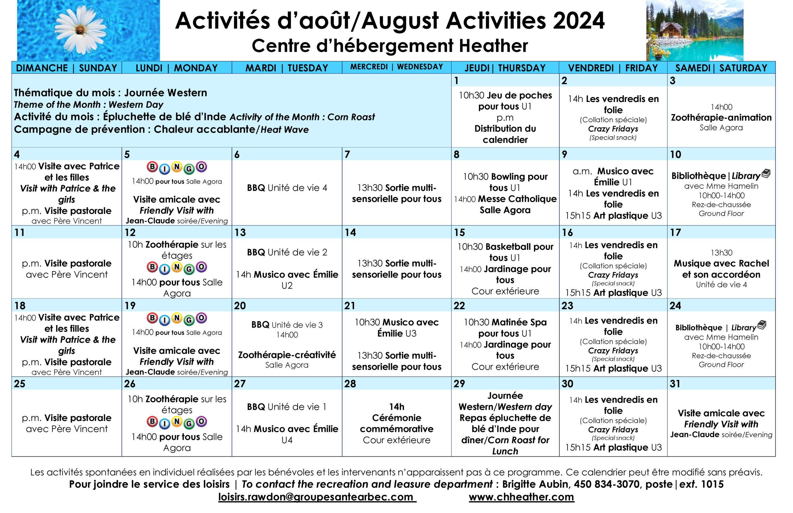 Calendrier des loisirs du mois d’août 2024 pour les résidents du CHSLD Heather