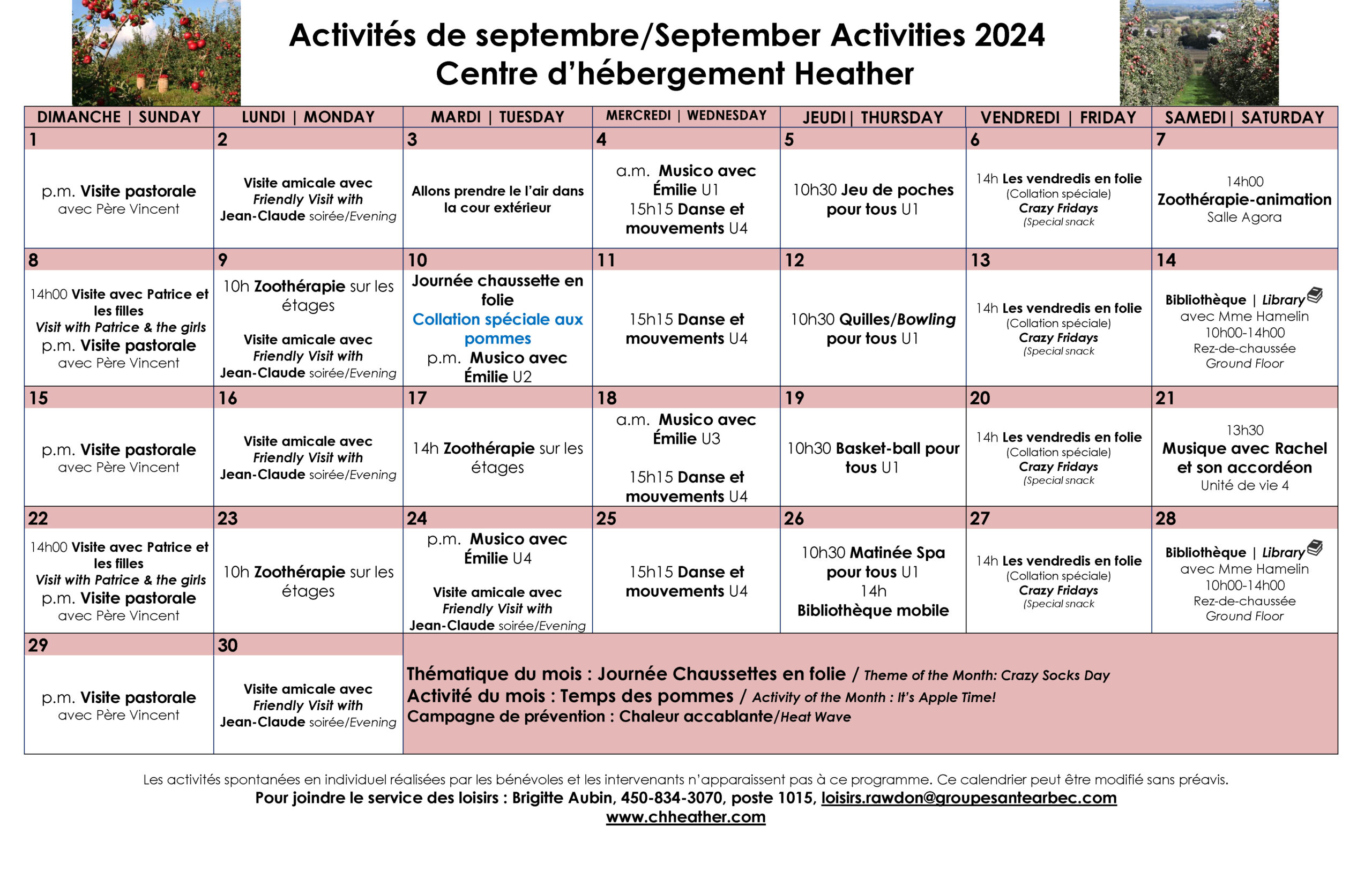 Calendrier des loisirs du mois de septembre 2024 pour les résidents du CHSLD Heather