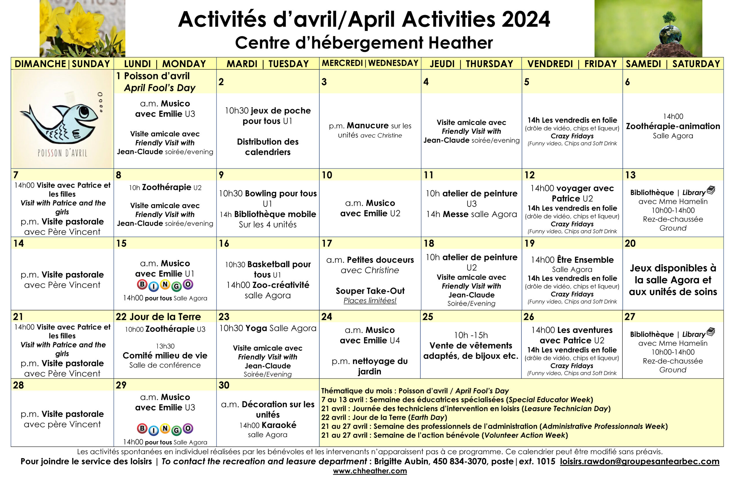 Calendrier des loisirs du mois d’avril 2024 pour les résidents du CHSLD Heather