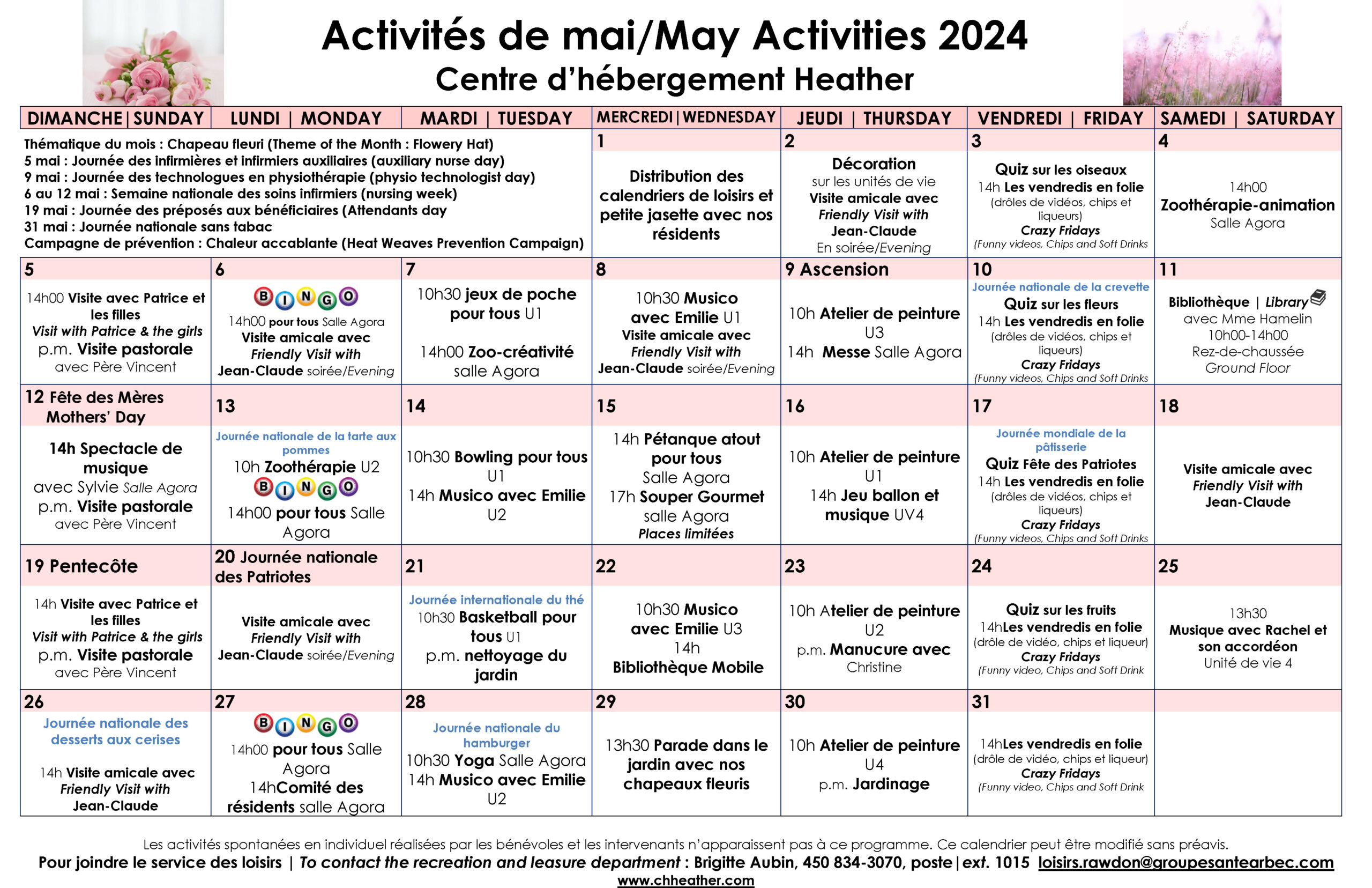 Calendrier des loisirs du mois de mai 2024 pour les résidents du CHSLD Heather
