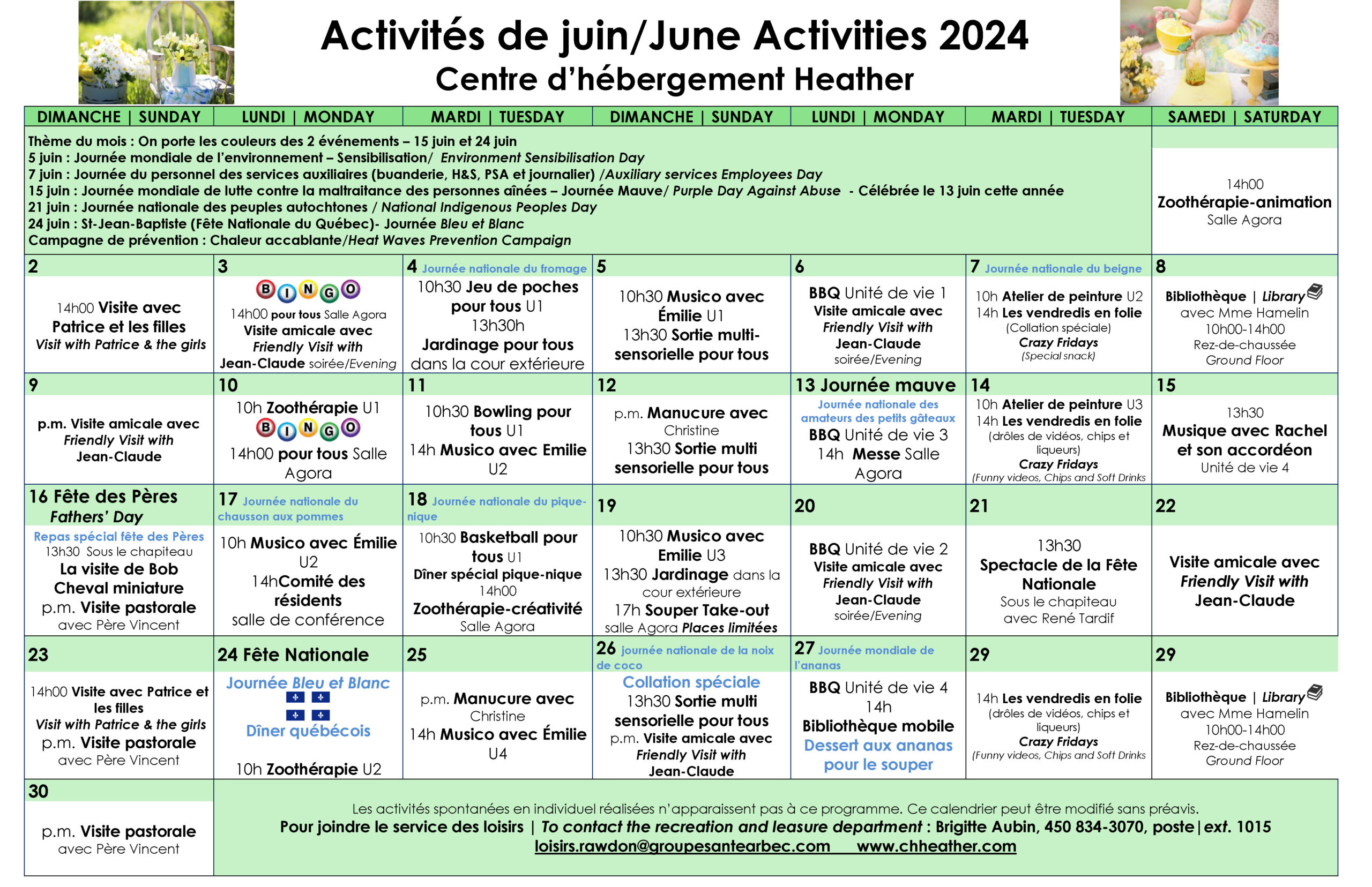 Calendrier des loisirs du mois de juin 2024 pour les résidents du CHSLD Heather