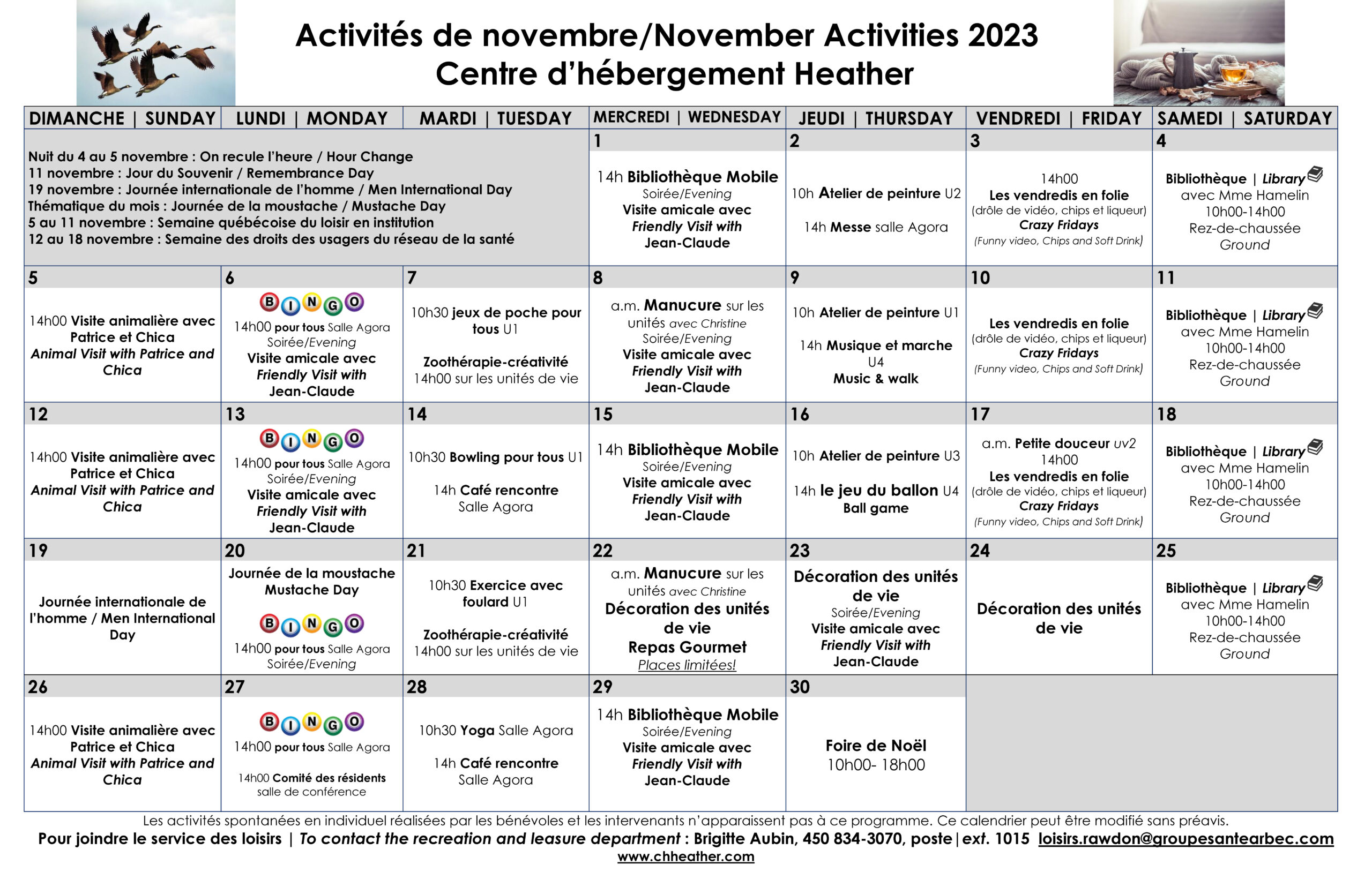 Calendrier des activités de loisirs du mois de novembre 2023 pour les résidents du CHSLD Heather