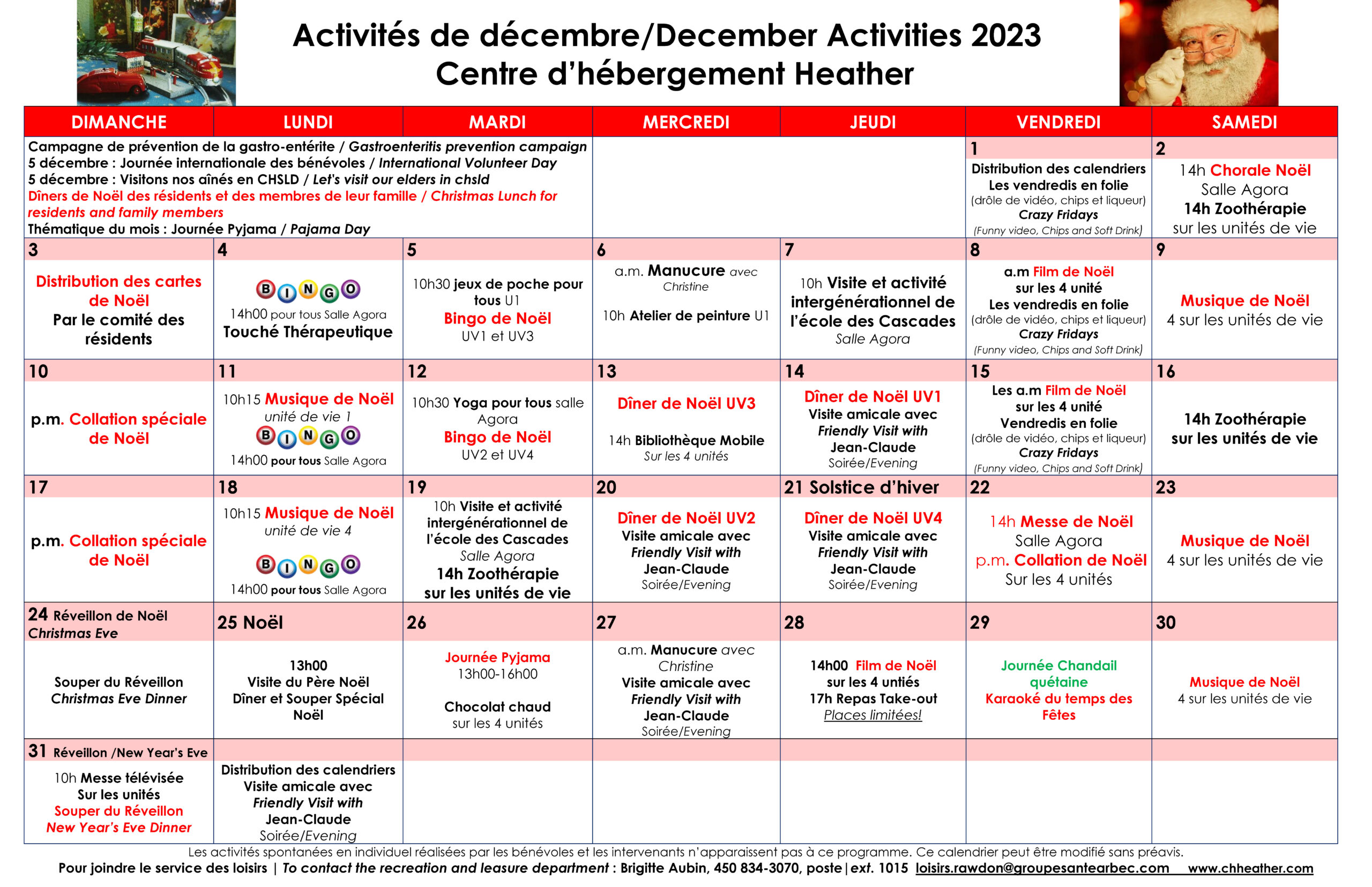Calendrier des activités de loisirs du mois de décembre 2023 pour les résidents du CHSLD Heather
